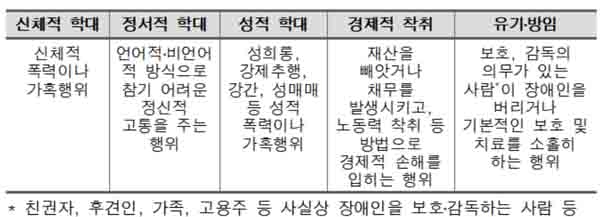 장애인 학대 유형은 신체적 학대, 정서적 학대, 성적 학대, 경제적 착취, 유기·방임 등 5개 유형으로 분류했다.