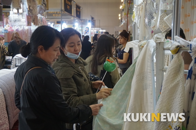 4일 오후 서울 세종대학교 컨벤션센터에서 열린 '제3회 프리미엄 서울 베이비 키즈페어(이하 프리미엄 서베키)'에서 관람객들이 아기이불을 살펴보고 있다.