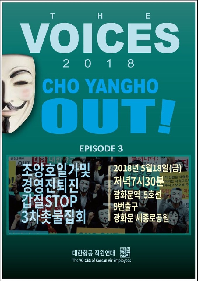 대한항공 직원연대가 조양호 회장 일가의 경영진 사퇴를 촉구하며 3차 촛불집회를 연다.