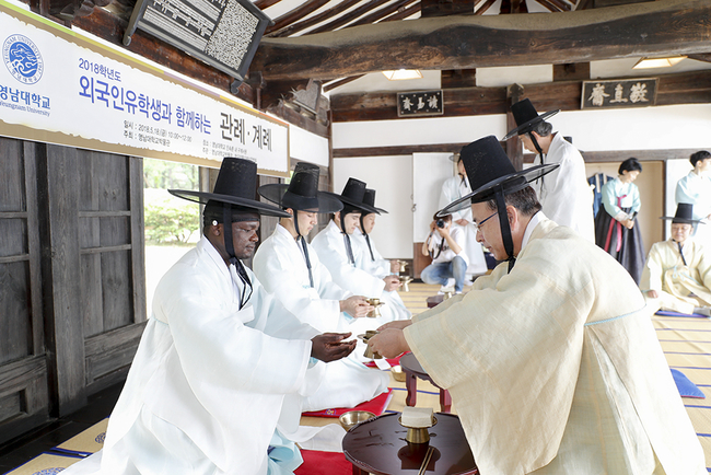 영남대학교는 18일 오전 경산캠퍼스 내 구계서원에서 외국인 유학생을 대상으로 ‘전통 성년식’을 가졌다.