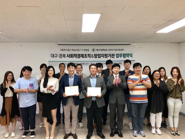 대구대 사회적기업지원센터는 지난 17일 경산캠퍼스 생명환경대학에서 대구·경북 소재 사회적기업, 마을기업, 협동조합 및 사회적기업가 육성사업 7기 창업팀 등(이하 사회적경제조직)과 사회적경제 활성화를 위한 업무협약을 체결했다.