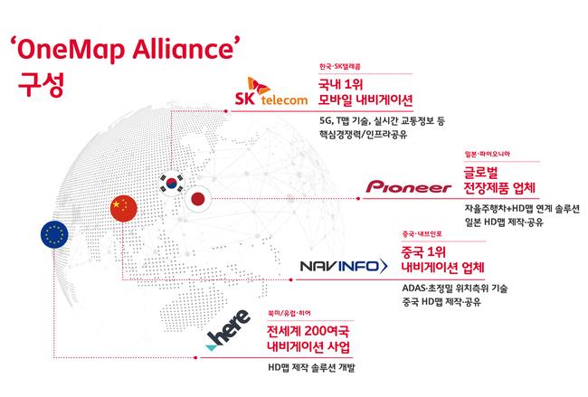 23일 SK텔레콤에 따르면 원맵 얼라이언스에 참여한 기업은 한국 SK텔레콤, 유럽 히어(HERE), 중국 내브인포(NavInfo), 일본 파이오니아(Pioneer) 등 4개 회사다.