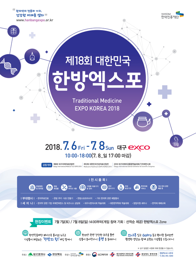 올해로 18회째를 맞는 ‘제18회 대한민국한방엑스포’는 대구시와 경상북도가 주최하고 보건복지부 후원하는 국내 최대 규모의 한의약 관련 전시회다.