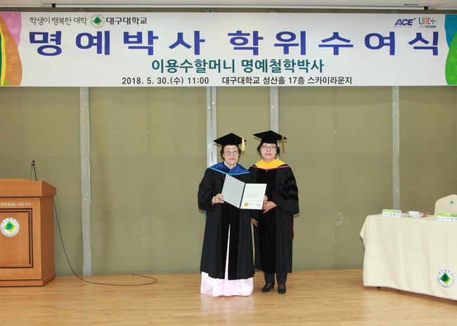 대구대는 인류 평화와 인간 존엄의 가치를 널리 알리는 데 공헌한 이 할머니의 공로를 높이 평가해 명예철학박사 학위를 수여했다.