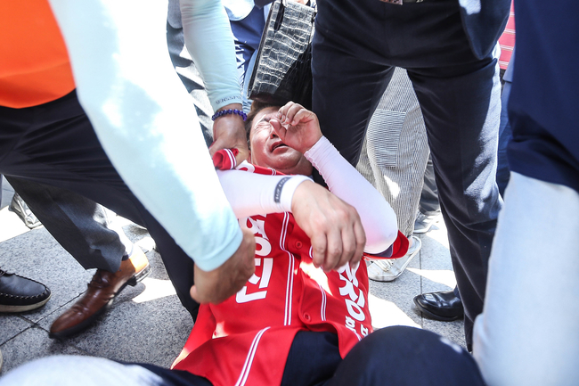 이 때문에 권 후보의 연설은 5분 만에 중단됐고, 이를 막는 경찰과 몸싸움이 벌어지기도 했다.