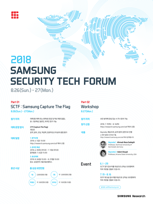 보안기술 워크샵은 오는 8월27일 개최되며, 해외 석학과 국내 저명한 연사의 초청 강연과 패널토의로 진행된다. 보안 분야에 관심이 있으면 누구나 참여 가능하며, 참가신청은 다음달 19일부터 오는 8월16일까지 삼성리서치 홈페이지를 통해 할 수 있다.