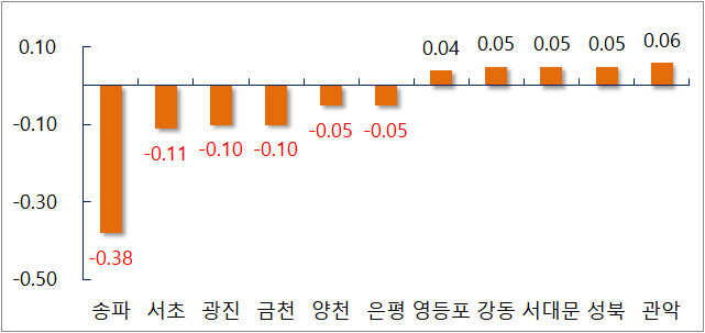 송파와 서초를 필두로 ▲광진(-0.10%) ▲금천(-0.10%) ▲양천(-0.05%) ▲은평(-0.05%) 순으로 전세가격이 하락했다.