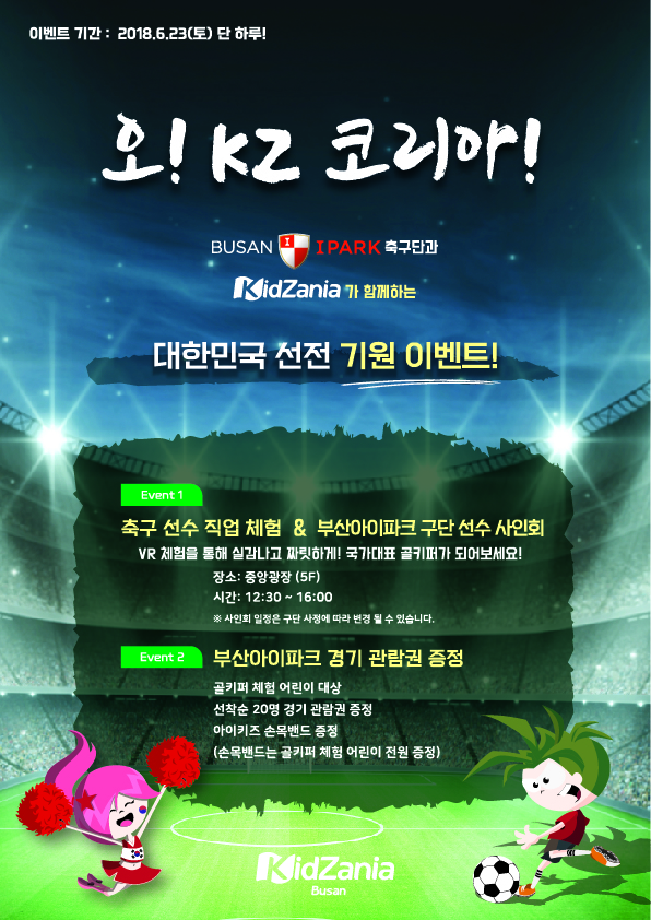 키자니아 부산이 부산 아이파크와 함께 대한민국 선전을 기원하는 이벤트 ‘오 KZ 코리아’ 를 부산 해운대에서 개최 한다.