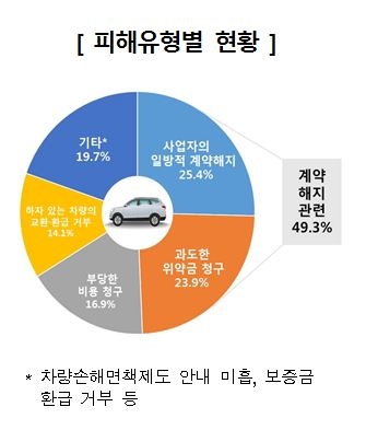 최근 5년간 소비자원에 접수된 장기렌터카 관련 피해구제 신청은 총 71건으로 집계됐다. 피해유형별로는 ‘사업자의 일방적 계약해지’, ‘중도해지 시 과도한 위약금 청구’ 등 계약해지 관련이 49.3%으로 가장 많았다.