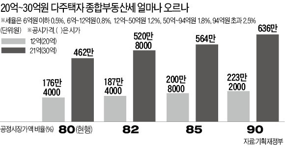 기재부에 따르면 시가 20억 원, 공시가격 14억원의 다주택 보유자는 종부세 부담이 현행 176만원에서 223만원으로 47만원 늘어나게 된다. 또 시가 30억원, 공시가격 21억원을 보유한 다주택자는 현행 462만원에서 최고 636만원으로 세금 부담이 174만원 늘어난다.