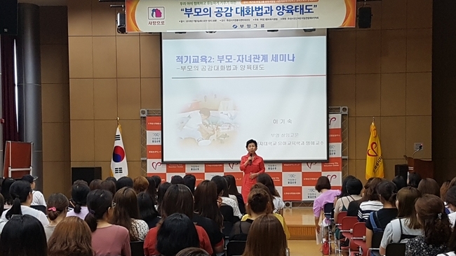 부영그룹은 지난 3일 오전 경기도 화성시 자원봉사센터에서 화성 향남 학부모들을 대상으로 ‘부모의 공감대화법과 양육태도’를 주제로 한 강연을 개최했다. 강연은 이기숙 이화여대 명예교수가 맡았다.