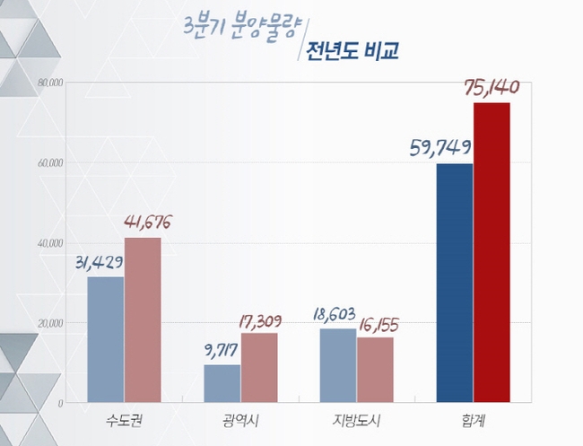 시도별로 검단신도시 분양이 계획된 인천에서 분양물량이 7800여 가구 늘고 대구와 경기도에서도 각각 3730가구, 3984가구 증가한다. 울산에서는 작년 3분기 분양물량이 없었지만 올해에는 1585가구가 분양 예정돼 있다.