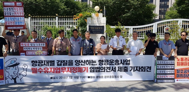 공공운수노조 항공연대협의회(협의회)는 19일 서울 광화문 정부청사 앞에서 회견을 열고 “항공노동자의 과도한 파업권 제한은 세계적으로 유래가 없고 위헌 소지마저 있다”며 노조법 개정 입법 의견서를 노동부에 제출했다. 항공연대협의회엔 아시아나항공노조, 아시아나조종사노조, 대한항공조종사노조, 한국공항공사노조 등으로 이뤄져있다.