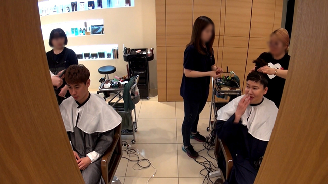 이영자가 매니저와 나란히 헤어숍에 앉아있는 모습이 포착됐다. 이날은 그녀가 생애 최초로 매니저와 동반 광고 촬영을 하는 날. 때문에 이날만큼은 매니저도 이영자와 함께 꽃단장을 하고 있는 것이다.