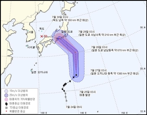 일각에서는 세력을 키우고 있는 제12호 태풍 ‘종다리’가 단비를 뿌려줄 것을 기대하고 있다. 기상청에 따르면 종다리는 27일 오전 3시 일본 오키나와 동쪽 약 1380㎞ 해상에서 시속 18㎞ 속도로 이동 중이다. 태풍 종다리는 일본을 통과한 뒤 오는 30일 오전 3시 독도 남쪽 약 160㎞ 해상에 이를 것으로 보인다.