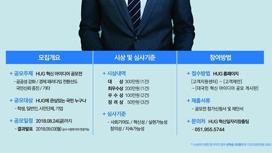 주택도시보증공사(HUG)는 사회적가치 구현 및 일자리 창출 등을 위한 참신한 혁신과제를 발굴하고자 대국민 아이디어 공모전을 개최한다고 31일 밝혔다.