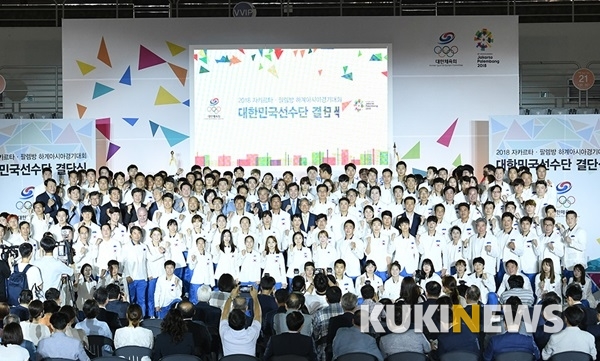 자카르타-팔렘방 아시안게임에 출전하는 대한민국 선수단이 힘차게 출사표를 던졌다.대한체육회는 7일 서울 송파구 올림픽 공원 내 SK핸드볼경기장에서 대한민국 선수단 결단식을 개최했다. 결단식에는 약 600명의 선수단을 비롯해 이낙연 국무총리, 이기흥 대한체육협회장, 김성조 선수단장 등이 자리해 자리를 빛냈다.