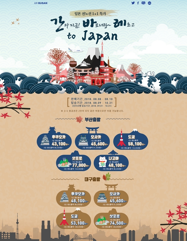 에어부산이 오는 8일부터 일본 전 노선 대상으로 한 명 가격에 두 명이 떠날 수 있는 1+1 특가 항공권을 이벤트를 실시한다.