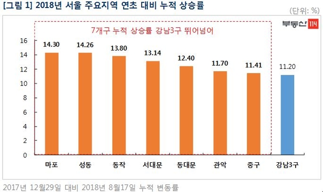 정부가 서울 전역을 대상으로 투기 점검에 나섰지만 개발 호재가 풍부한 은평·여의도·용산과 그 인근에 위치한 서대문, 양천 등 비강남권이 집값 상승을 주도하고 있다. 실제 올해 서울 아파트 매매가격 상승을 주도한 곳은 비강남권 지역들로 확인된다. 업계에 따르면 마포와 성동, 동작, 서대문, 동대문, 관악, 중구 등 7개 구의 연초대비 누적 상승률이 강남3구(11.20%)를 뛰어넘은 것으로 나타났다.
