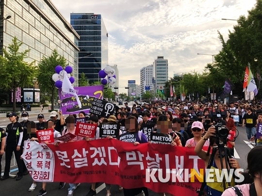 행진 대열은 청와대가 보이는 광화문 사거리에 멈춰서 “사법부가 이따위면 누가 법을 존중하는가. 무늬만 성적자기결정권이지 내용은 정조 운운한 사법부가 문제다. 죄지은 사람이 벌 받아야 사법정의가 실현된다”고 외쳤다.
