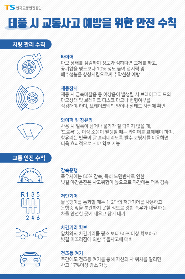 자동차 업계 전문가는 “폭우상황에서는 시야 확보가 어렵고 마른 노면에 비해 제동거리가 길어지는 등 평소보다 위험요인이 증가한다”며 “폭우와 강풍때에는 평소보다 50%이상 속도를 감속하고 주간에도 전조등을 켜는 것이 안전운행에 도움이 된다”고 말했다.