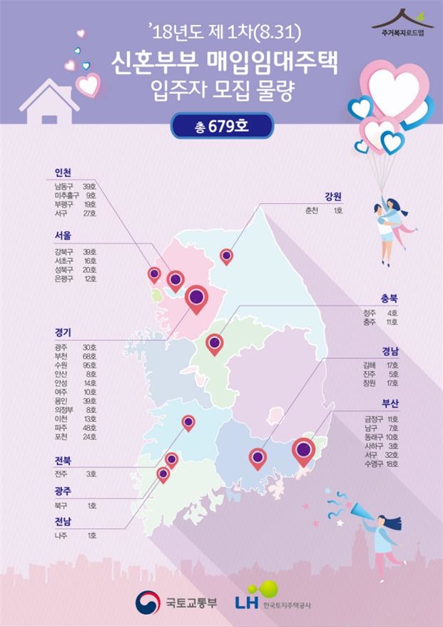 LH는 올해 신혼부부용 매입임대주택으로 1216호를 매입했으며 이중 수리·도배·장판 등 입주 준비가 완료된 전국 34개 시군구의 679호에 대해 처음으로 입주자를 모집한다. 나머지 537호도 연내 공급될 예정이다.