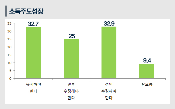 현행 소득주도성장 정책을 현행대로 유지해야 한다는 의견은 32.7%로 조사됐다. 이어 ‘잘모름’ 9.4%로 나타났다.