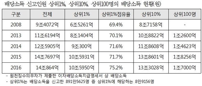 2014년부터 2016년까지 전체 배당소득은 11.9%(1조4,959억원) 늘어났다. 같은 기간 상위1%의 배당소득은 17.3%(1조5651억원) 증가했다.