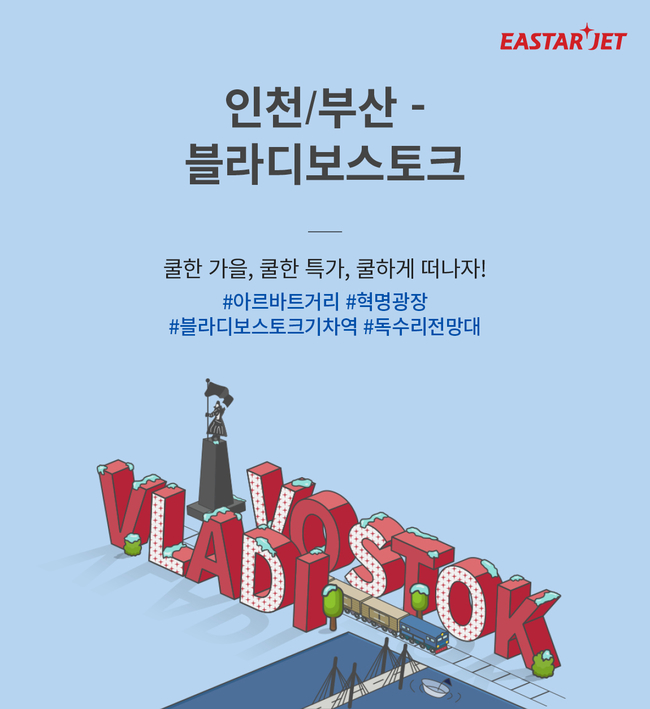이날 오후 2시부터 25일까지 14일간 ‘쿨한 가을, 쿨한 특가로, 쿨하게 떠나자’를 테마로 이스타항공의 러시아 노선인 인천-블라디보스토크와 부산-블라디보스토크 2개 노선에 대해 특가 이벤트를 실시한다.