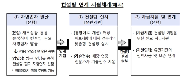 그는 “컨설팅 연계 지원 절차는 우선 은행에서 자영업자의 경영현황, 애로사항 및 성장가능성 등을 고려하여 컨설팅이 필요한 자영업자를 발굴․선정하고, 선정된 자영업자에게 소상공인시장진흥공단, 지역신용보증재단 등 유관기관이 전문컨설팅을 제공하겠다”고 설명했다.