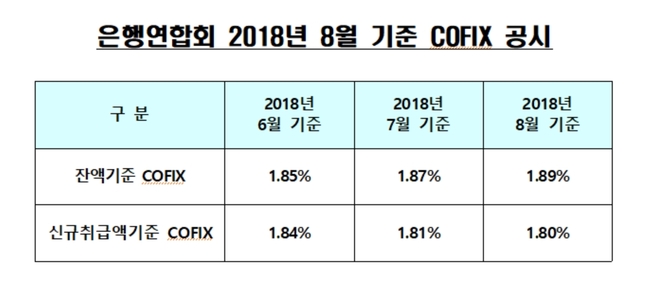 은행연합회는 8월말 잔액기준 코픽스는 1.89%로 전월대비 0.02%p 상승했다고 17일 밝혔다. 다만 신규취급액 기준 코픽스는 1.80%로 전월보다 0.01%p 하락했다.