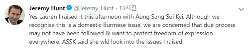 AFP 통신은 19일(현지시간) “헌트 장관이 이날 수지 장관을 만났다”며 “로힝야족에 대한 미얀마 군부의 탄압문제를 거론했다”고 보도했다.