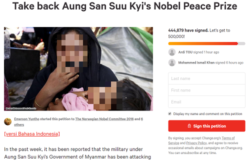 일각에서는 수지 장관의 노벨평화상을 박탈해야 한다는 주장이 나온다. 국제 온라인 청원 사이트 ‘체인지(Change)’에는 ‘수지 장관의 노벨평화상을 회수해야 한다’는 제목의 청원이 올라왔다. 청원자는 “실질적 미얀마의 지도자인 수지 장관이 자신의 나라에서 자행된 로힝야족과 인류에 대한 범죄를 묵과했다”며 “노벨평화상을 박탈해야 한다”고 주장했다. 해당 청원글에는 21일 오전 9시 기준 44만명이 넘는 네티즌들이 동의했다.