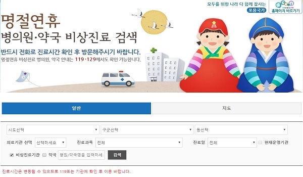 추석연휴 기간 중 문을 연 병·의원이나 약국 정보는 129(보건복지콜센터), 119(구급상황관리센터), 120(시도 콜센터)을 통해 안내받을 수 있다. 또한 응급의료포털 복지부 홈페이지, 응급의료정보제공 앱(App) 등을 통해 쉽게 찾을 수 있다.