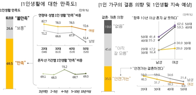 특히 여성이 남성보다 만족도가 높은 모습을 보였다. 남성은 50대에 만족도가 크게 하락하나, 여성은 연령대 상승에 따른 만족도 하락폭이 크지 않은 편이며, 4~5년째 1인 생활 중인 그룹의 만족도가 높게 나타나는 모습을 보이고 있다.