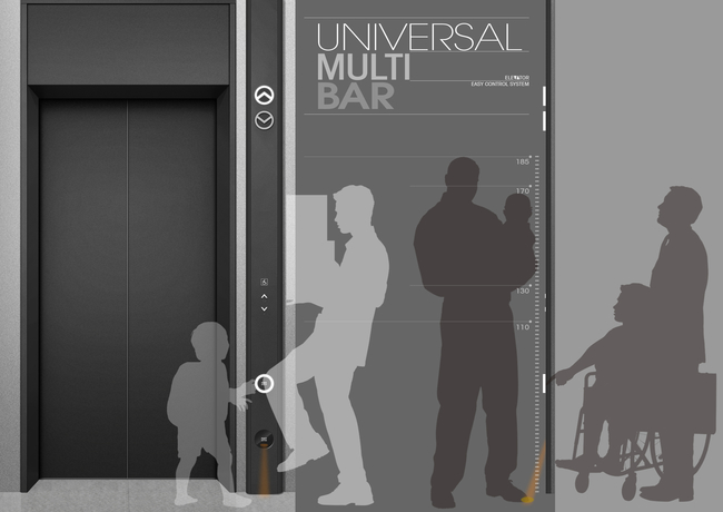 현대엘리베이터가 출품한 ‘유니버설 멀티 바’(Universal Multi Bar)는 기존 호출 버튼과 함께 성인 무릎 높이에 위치한 ‘무릎 버튼’, 센서 감지 구역에 발을 대면 엘리베이터를 호출하는 ‘터치리스 풋버튼’을 함께 적용했다. 물건을 든 사용자나 키가 작은 어린이, 휠체어 이용자 등 모든 승객이 제약 없이 엘리베이터를 호출할 수 있게 한 디자인이다. 엘리베이터의 상하 이동 방향을 알려주는 홀랜턴은 3D 입체형으로 디자인해 가시성을 높였다.