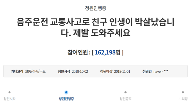 청와대 국민청원 홈페이지에는 ‘음주운전 처벌 강화’ 관련 청원이 4일 오후 3시 기준 500여개를 넘어섰다. 그중 ‘음주운전 교통사고로 친구의 인생이 박살 났다’는 제목의 청원이 가장 많은 동의를 얻었다.