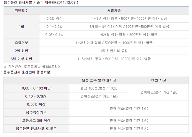 도로교통법 제44조 4항에 따르면 ‘술에 취한 운전자’는 혈중알코올농도가 0.05% 이상인 경우로 한다고 규정하고 있다. 도로교통법 제148조의 2항은 ▲단순 음주의 경우 3년 이하의 징역이나 1000만원 이하의 벌금 ▲음주운전으로 부상사고를 일으킨 경우는 10년 이하 징역 또는 500만원 이상 3000만원 이하 벌금 ▲음주운전으로 사망사고를 낸 경우는 1년 이상의 유기징역에 처한다고 규정하고 있다.