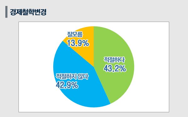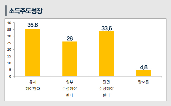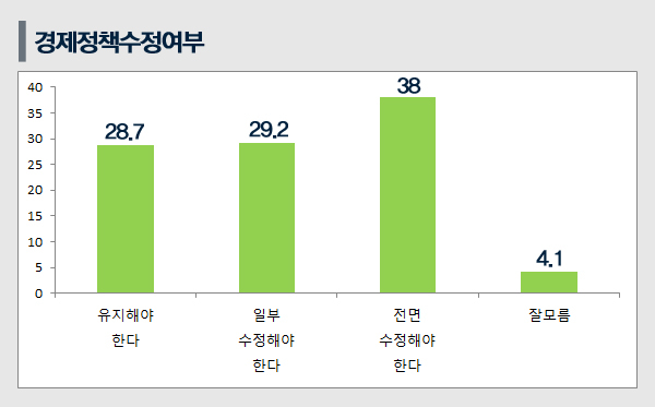 이와 함께 최저임금 인상 등을 포함하는 문재인 정부 경제정책의 핵심인 소득주도성장에 대해서도 59.6%(일부 수정 23.1%, 전면 수정 39.3%)가 ‘수정해야 한다’고 답했다. 이어 ‘유지해야 한다’ 35.6%, ‘잘모름’ 4.8%로 집계됐다.