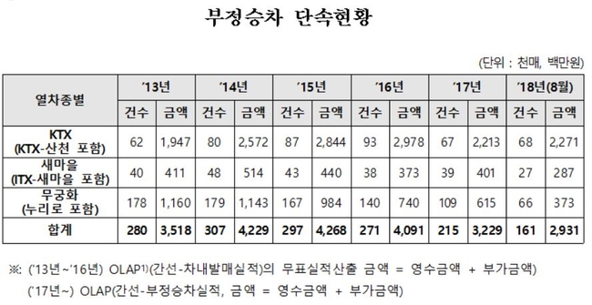 국회 국토교통위원회 소속 이후삼 의원(더불어민주당·제천단양)이 한국철도공사로부터 제출받은‘최근 5년간 부정승차 현황’ 자료에 따르면 KTX와 일반철도(새마을, 무궁화) 그리고 광역전철 등에서 부정한 방법으로 승차했다가 적발된 건수는 최근 5년간 무려 287만 6천건으로 나타났다. 이는 매년 평균 약 58만건의 부정승차가 적발된 셈이다.