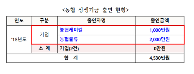 15일 국회 농림축산식품해양수산위원회 정운천 의원(바른미래당)이 농협으로부터 제출 받은 ‘농어촌상생기금 출연현황’ 자료에 따르면 농협중앙회 등 33개 회사 중 농어촌 상생협력기금에 출연한 회사는 농협케미컬 1000만원, 농협물류 2000만원이 전부인 것으로 나타났다.