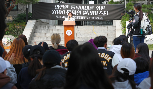 행사에 참석한 박종화 동덕여대 총학생회장은 이날 “대학 강의실에서 알몸의 남성이 음란행위를 하는데 어떻게 학교는 아무것도 모를 수 있느냐”며 “학생들이 민원 넣고 청원 올리고 언론에 알리는 사이 학교는 도대체 무엇을 했는지 모르겠다”고 비난했다.