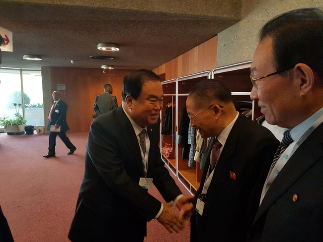제139차 국제의회연맹(IPU) 총회가 스위스 제네바에서 15일(현지시간) 열렸다. IPU 오전 일정을 마친 후 문 의장은 제네바 시내에 위치한 캄펜스키 호텔에서 리원장과 북측 대표단 2명을 만났다.