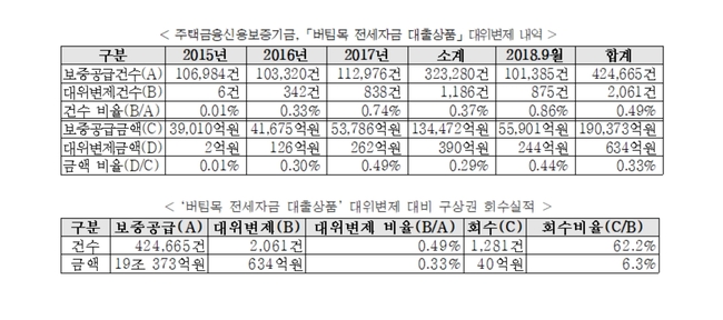 19일 국회 정무위원회 김정훈(자유한국당) 의원이 한국주택금융공사에서 제출받은 자료에 따르면 최초 보증 공급이 시작된 2015년 1월~2018년 9월까지 대위변제 건수는 총 2061건이며, 대위변제 금액은 634억원으로 이는 전체 보증공급(건수) 대비 0.49% 수준으로 나타났다.