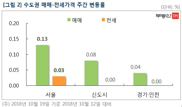 부동산114에 따르면 10월 셋째주 서울 아파트 매매가격은 0.13% 상승하는데 그쳤다. 8월 말 이후 상승률이 지속적으로 줄고 있다. 재건축 아파트값은 지난주 0.16%에서 0.08%로 둔화했다.
