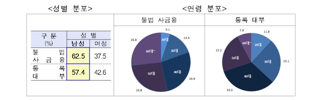 불법사금융이용자는주로경제활동중생활‧사업자금이 필요한 월소득 200~300만원대(20.9%)이고 40~60대(80.5%) 남성이며, 자금용도는 사업자금(39.5%), 생활자금(34.4%), 기존 대출금 상환(14.2%) 순이다.