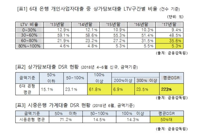 최근 5년간(2013~2017) 상가담보대출의 LTV 60%를 초과하는 건의 비중이 26.5%에서 40.9%로 증가한 것으로 나타났다. 특히 상가담보대출의 평균 DSR(연소득대비 연원리금상환율)은 223%에 달해 상가담보대출에 대한 규제 강화가 필요하다는 지적이 제기됐다.