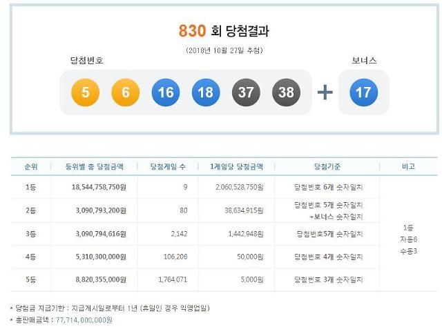 27일 제830회 나눔로또 추첨 결과 1등 당첨번호는 ‘5, 6, 16, 18, 37, 38’이고, 2등 보너스 번호는 ‘17’이다.