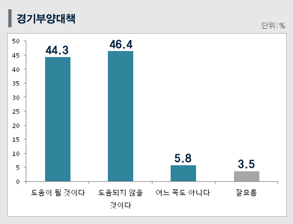정부의 유류세 인하와 일자리 대책 등 경기부양책이 경제에 도움되지 않을 것이라는 의견이 상대적으로 많은 것을 나타났다.