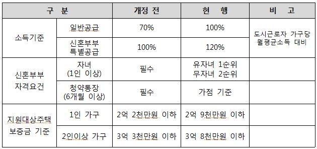 신혼부부 특별공급 입주자격도 완화해 자녀유무를 우선순위요건(유자녀 1순위, 무자녀 2순위)으로, 청약통장 유무는 가점기준으로 변경했다. 이로써 창약통장이나 자녀가 없는 신혼부부도 특별공급 신청이 가능하다.